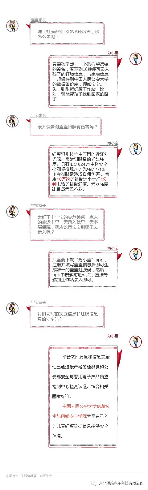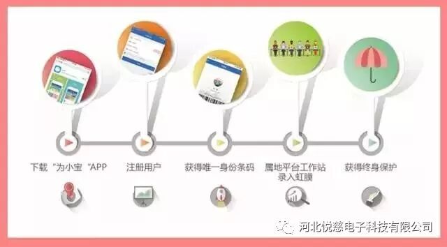 用户到中国儿童虹膜防丢网络平台属地工作站录入虹膜,事先做好预防措施,给孩子一生的安全保障;“为小宝”APP定期推送儿童安全专题知识,提高家长对儿童安全的认识,指导家长日常教育孩子,测评孩子的防拐意识水平。