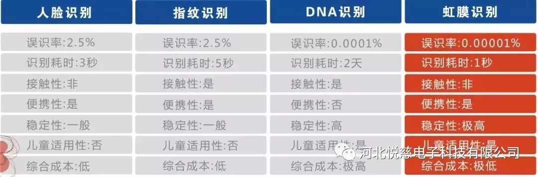 虹膜识别与指纹识别、人脸识别,DNA识别相比,虹膜识别在稳定性、准确性、生物检测性等方面,具有明显优势。它能提取出200多个量化信息点,且具有唯一性,误识率可低至千万分之一。而指纹识别的误识率为0.8%,人脸识别为2%,DNA为0.0001%。