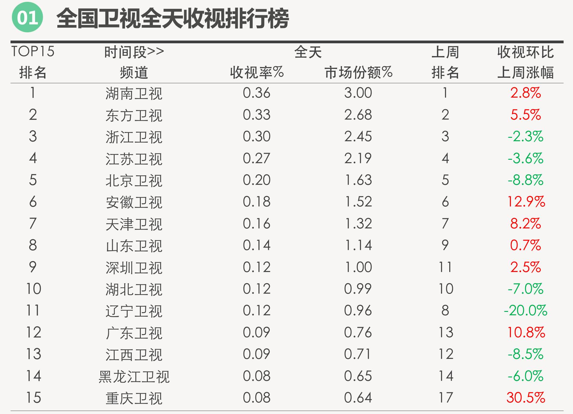 上周,全天收视涨跌持平,大体格局变化不大。前7位的卫视排名与上周排名一致,稳住了各自的地位。辽宁卫视却从上周的第8位,滑落至第11位,跌幅达到20.0%,小编都为你感到揪心。当然上周也有努力争上游的卫视小可爱,重庆卫视凭借30.5%的涨幅,强势入榜。这么努力的小卫视,特此表扬,以资鼓励。
