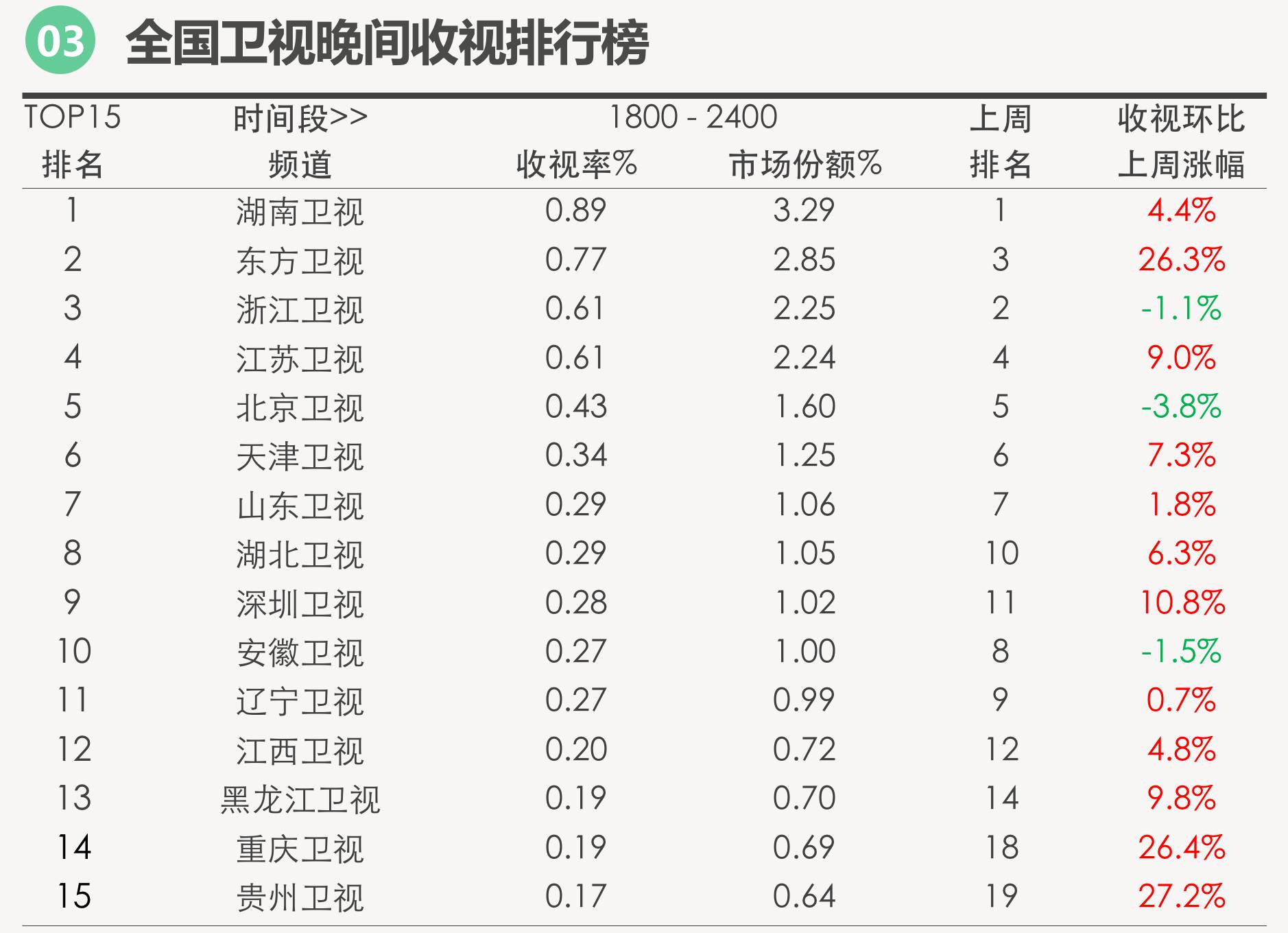 上周晚间时段收视全面逆袭,一扫上周的颓势,红色涨幅占领高地!其中东方卫视26.3%的涨幅使其排名回升1位,小进步让人欣喜。重庆卫视26.4%的涨幅,完成了全白晚都入榜的新成就。有涨就有跌,上周北京卫视、安徽卫视、浙江卫视分别跌幅3.8%、1.5%、1.1%,成为仅有的绿色。