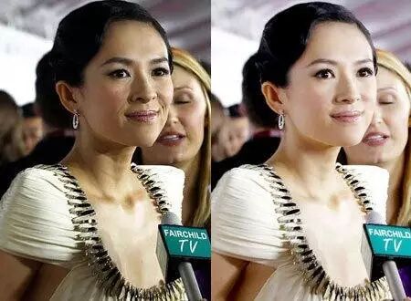 章子怡五官精致,可也就是败在肤色不好和斑太多上,一经PS,立刻变身白富美。