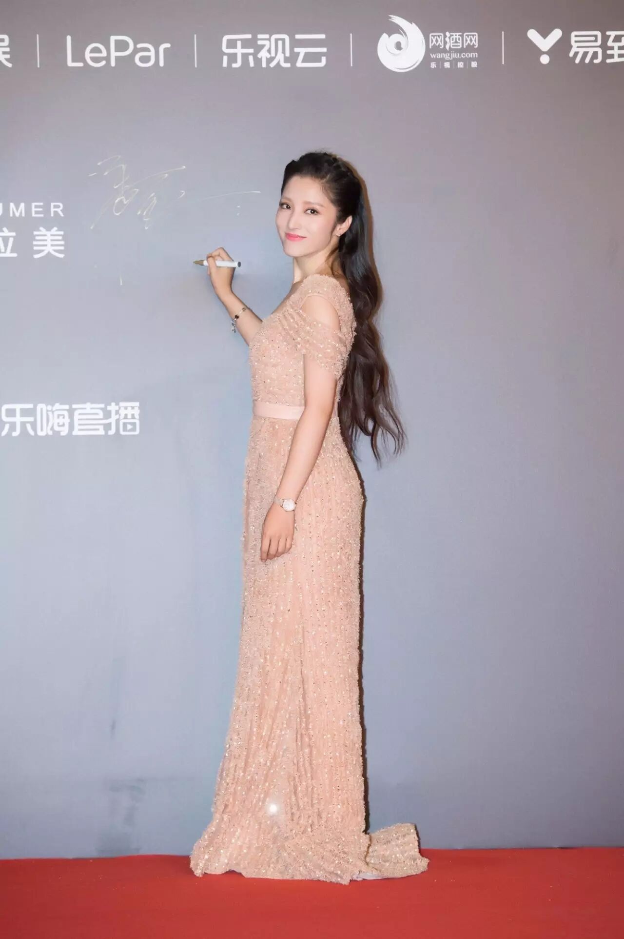 潘辰身穿粉色高开叉长裙,青春靓丽又不失轻熟性感