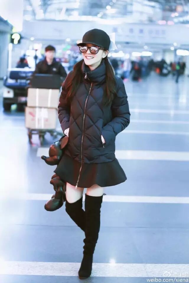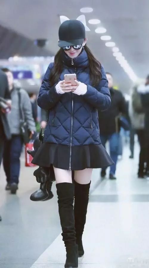 关键是上身穿的这么厚,下身就是一双过膝长靴,露出来大白腿又细又长,这是在学大幂幂吗?