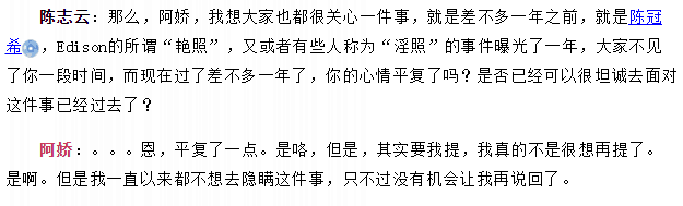 在艳照门事件过去一年后的2009年,阿娇做客由陈志云主持的节目《志云饭局》时,提及艳照门事件以及陈冠希的往事,阿娇依旧坦诚的说,陈冠希是她交往的男友中时间最长的一个,也是她最爱的一个,两人是一见钟情。