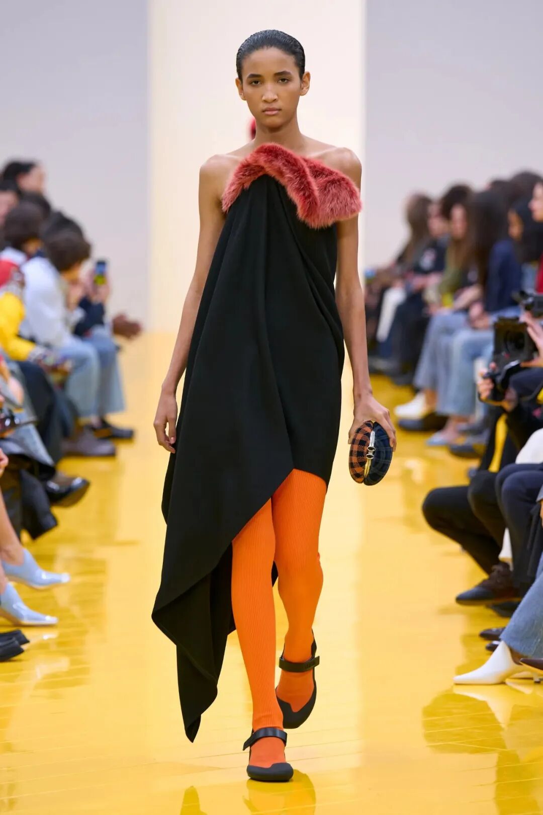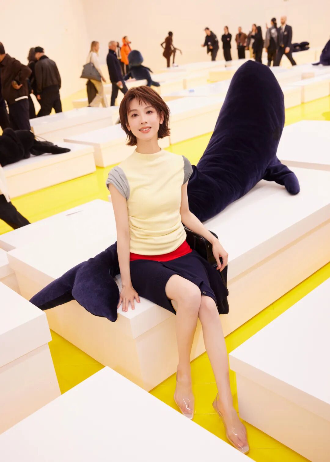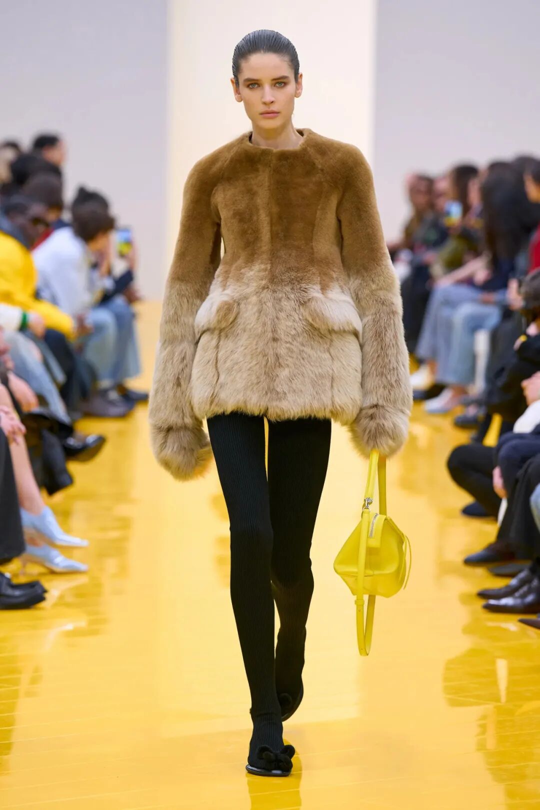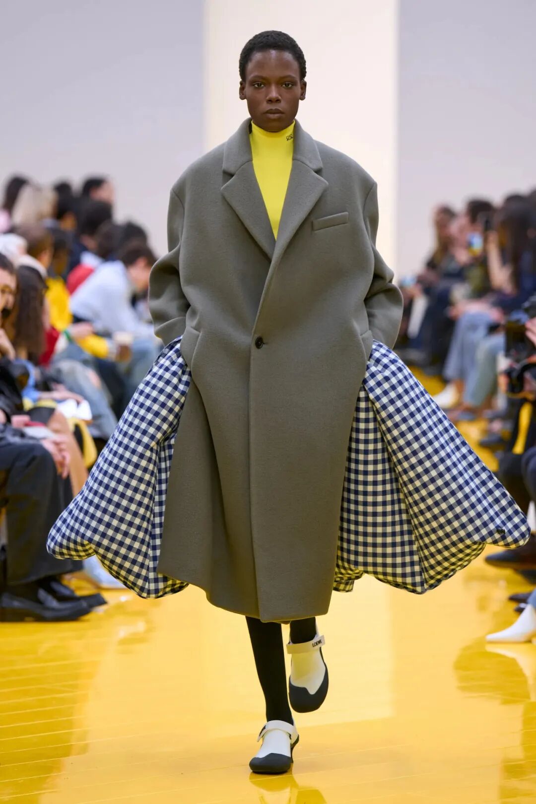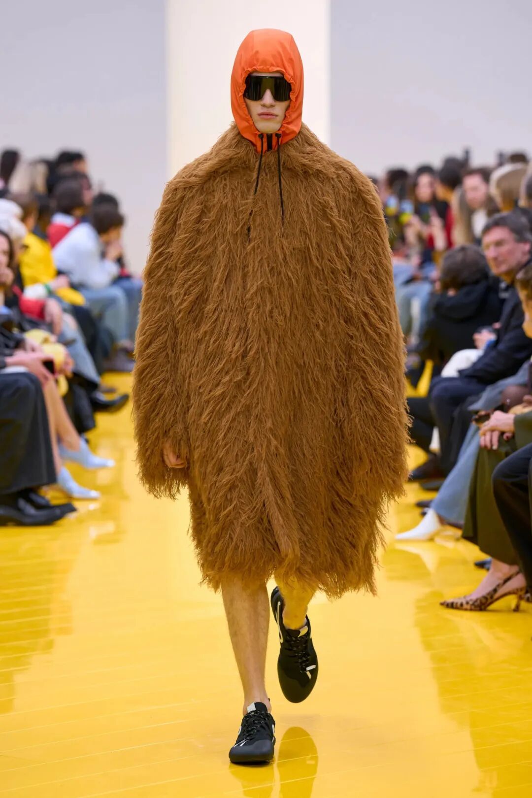 随着一条极具能量的明黄色T台,整个秀场铺展开来。来自德国艺术家Cosima von Bonin的海洋生物、狗狗形象等艺术装置犹如到场的“神奇观众”和嘉宾们一同坐在巨型鞋盒之上,静静等待着新季秀场启幕。