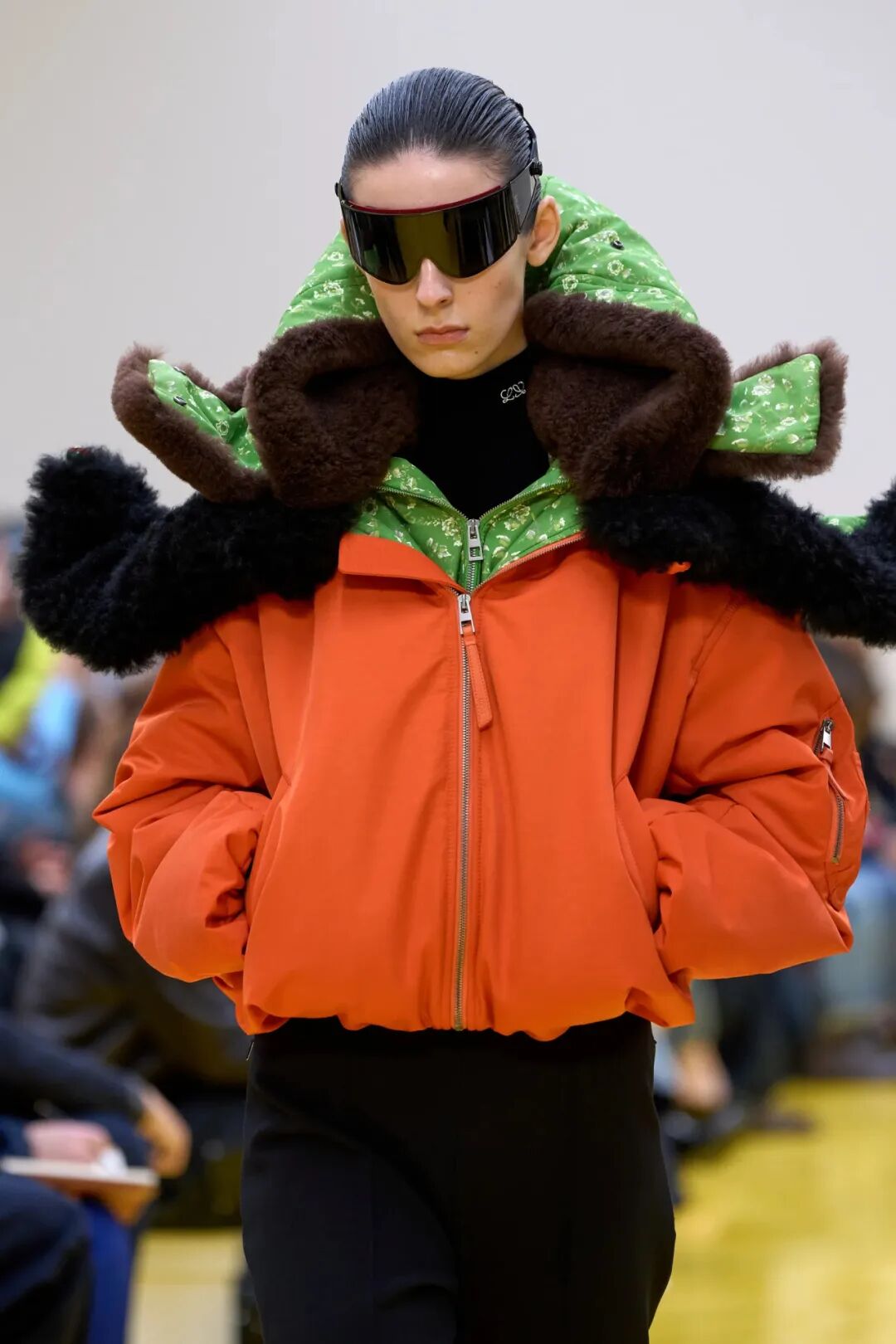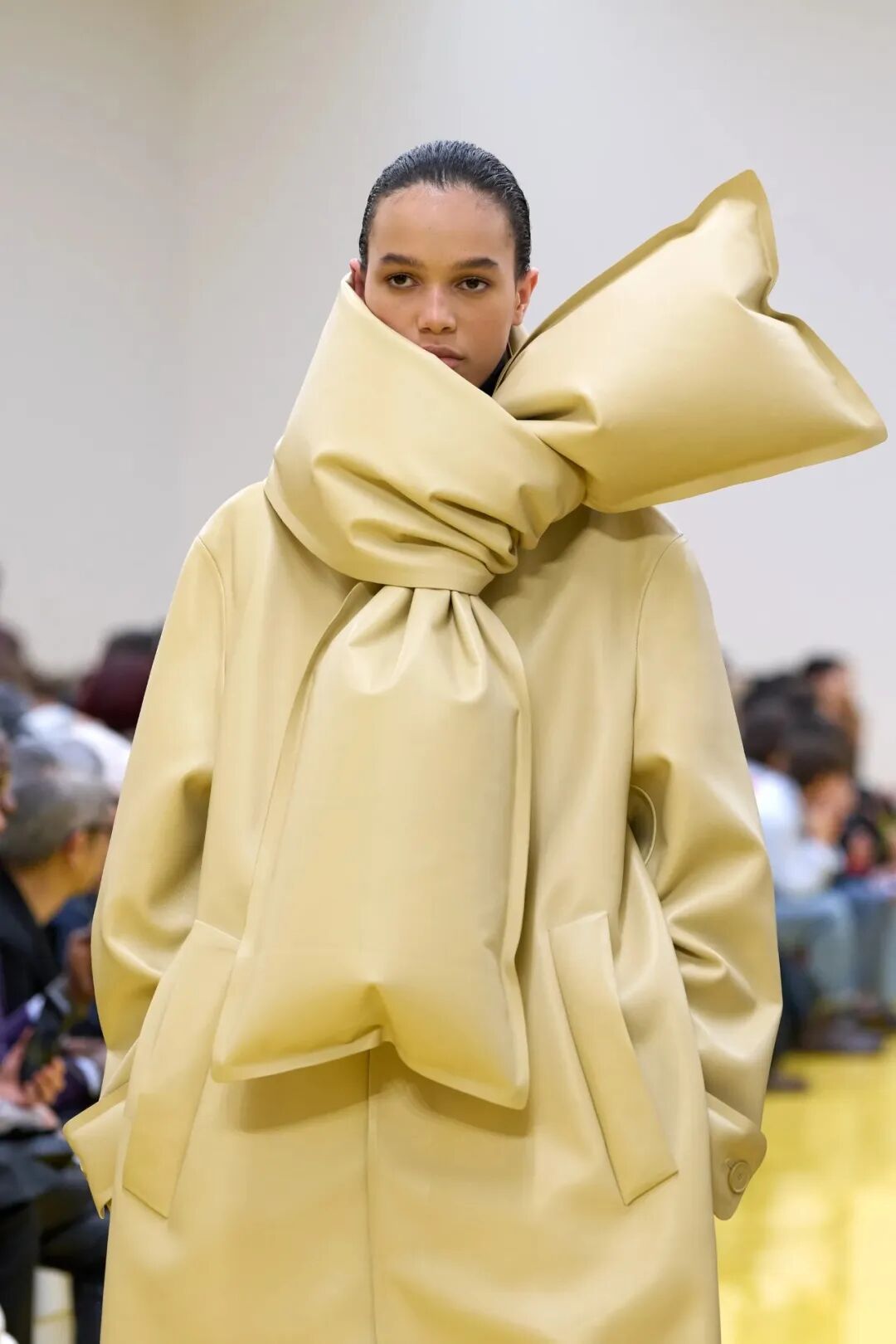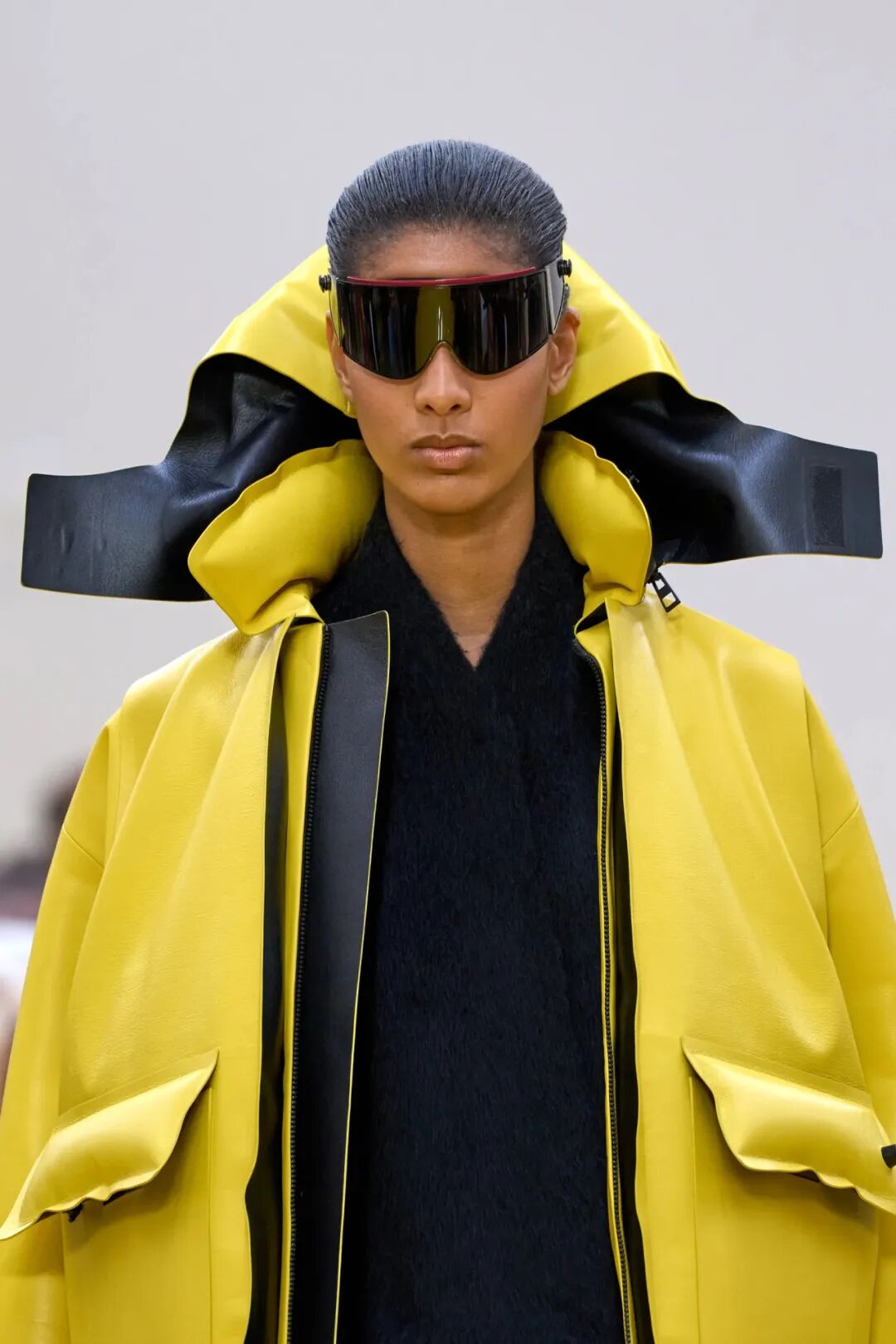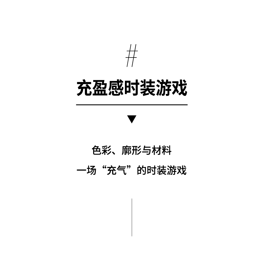 更耐人寻味的是那些“跳脱出常规”的细节。比如看起来像充气U形颈枕的结构,被直接转化到了夹克的帽子与衣领上。它们包裹着脖子,向两侧延伸,漂浮在肩膀上。玩趣幽默中带着一点天马行空的纯真可爱。