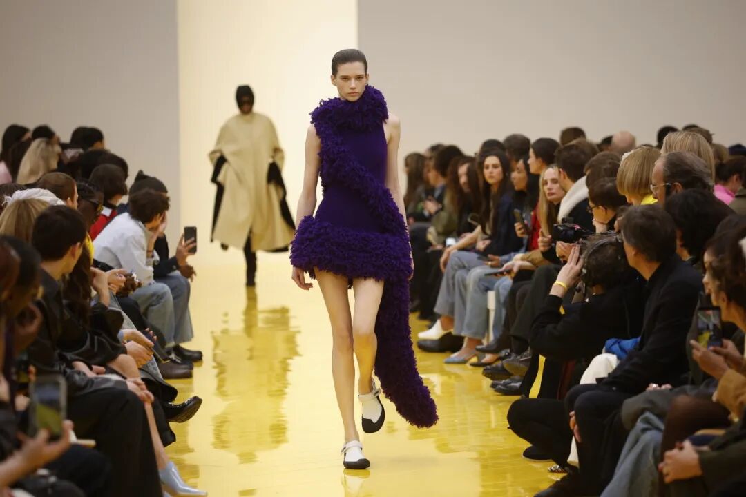大秀开始,颜色便率先抓住了观众的视线。亮橙、明黄、湛蓝等这些高饱和度色块像颜料盘被随意撒进秀场,与秋冬惯常的黑、灰、深棕和卡其形成强烈对比。