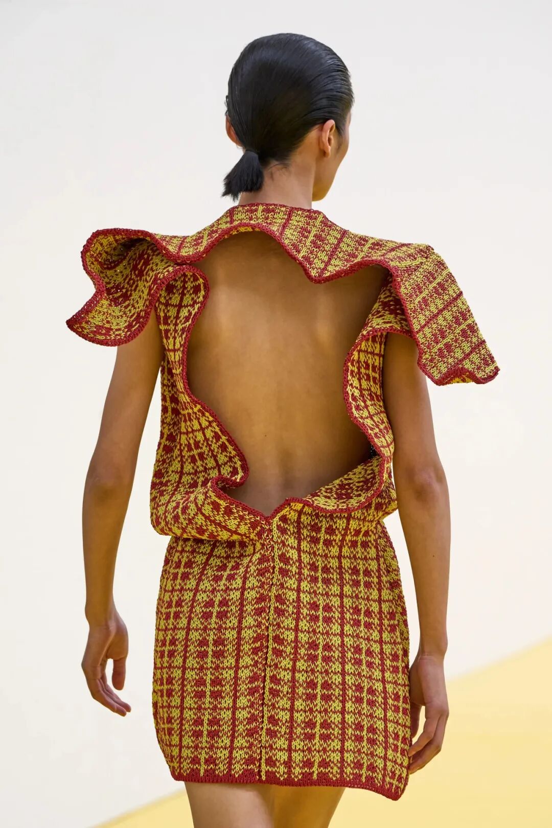 不同质感、不同体量、甚至看似完全不搭的单品,都可以被重新组合一件极简黄色针织衫,可以搭配毛绒迷你裙;廓形大衣的毛绒边将轻盈质地和轻柔触感结合;针织格纹连身裙的背面,藏着另一种露肤的性感张力。