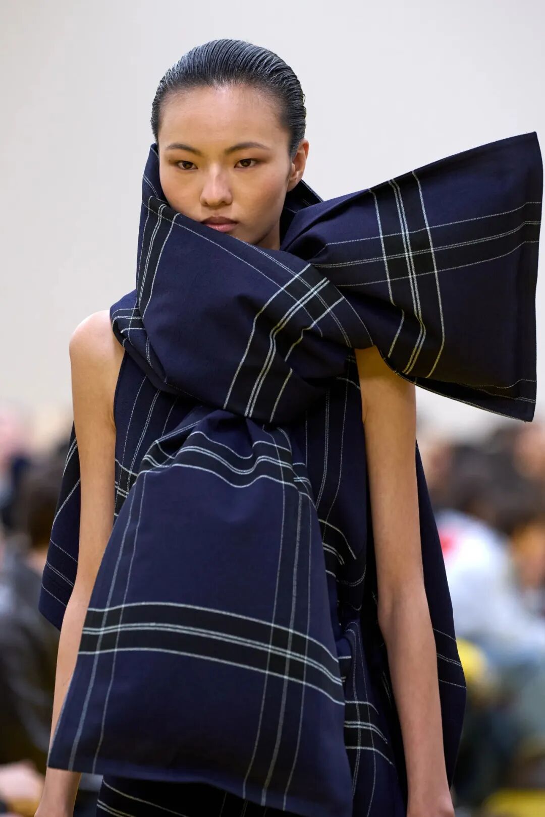 而那些类似的“充气感”语言也从预告片中延伸到了秀场上的其他单品。蓬松夹克、大围巾像被空气撑起,还有一些大衣的侧面甚至伸出两块格纹内衬,像突然展开的翅膀。当这些夸张体量出现在T台上时,时装突然拥有了一种超越次元的力量。
