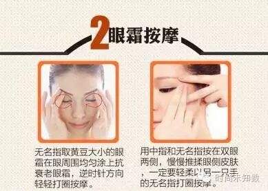无名指取黄豆大小的眼霜在眼周围均匀涂上抗衰老眼霜,逆时针方向轻轻打圈按摩。