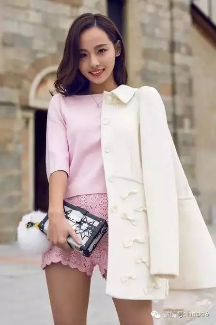 张嘉倪长相清纯甜美,这身粉色套装很适合她,蕾丝镂空款短裤更是把她的修长美腿展现出来,搭配白色长大衣很清新优雅,手拿的四方包更是最近的时尚单品,浅浅笑起来女神范十足。
