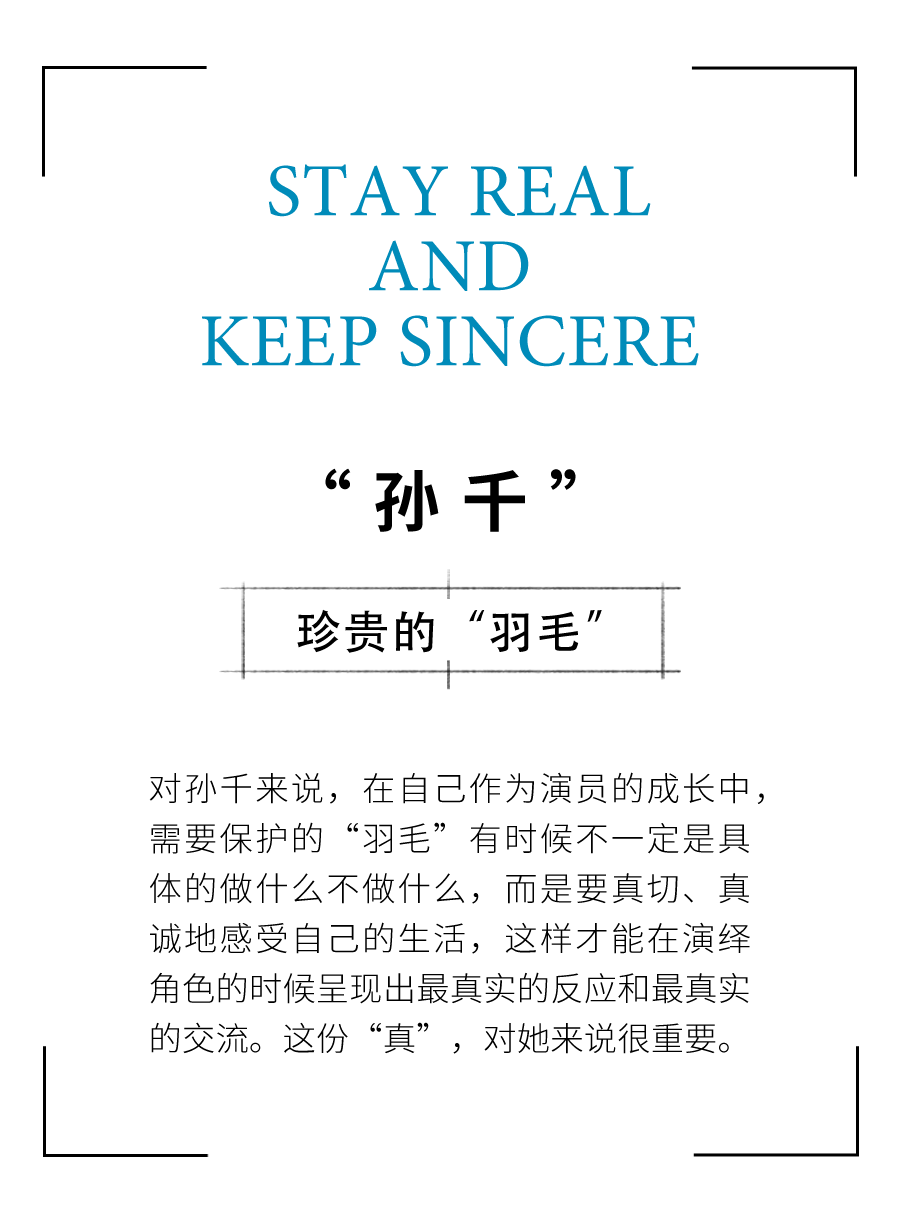 “我希望自己能保持真诚”,孙千说,这是她对现在及未来自己的期许。她希望就像现在这样,继续真切地感受生活里的一切,每一个身边的人,每一个具体的事物,“活在当下,此时此刻,想做什么就去做。如果不对就改正,如果对了就继续做,不一定每天都这么年轻,有这么多冲动的想法,既然有,那就去珍惜它”。她了解自己,只有这样真切地感受过,成为角色的那一刻,呈现出的状态和反应才是真实的,这是作为演员的她最想要保护的那份珍贵的“羽毛”,她要守护好这份“真”。