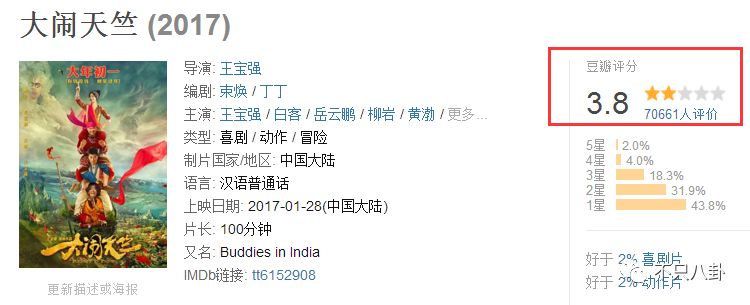 关于王宝强的奖项,《大闹天竺》让他获得最令人失望的导演称号绝不委屈。毕竟去年上映的时候差评海了去了,豆瓣评分也只有可怜的3.8。
