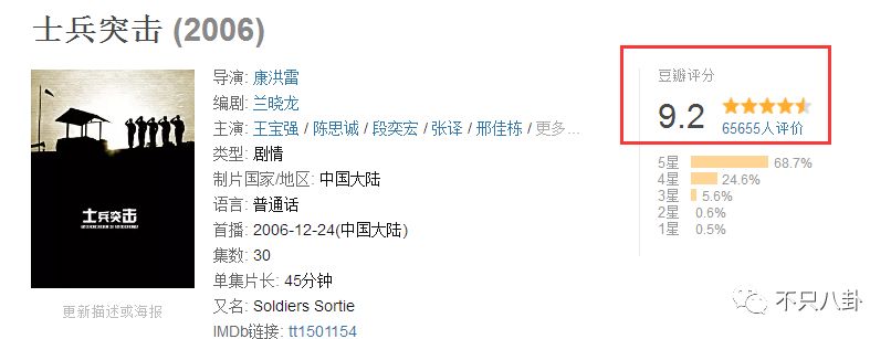 除了电影成绩厉害之外,王宝强在电视剧领域的表现更是少有人能匹敌。《士兵突击》就不用说了,现象级神剧,豆瓣9.2高分,十多年过去了还有人爱的不能自拔,几乎成了我们国家另类的征兵广告了。