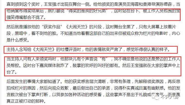 颁奖现场,王宝强笑着接受了大家的打趣,不过当主持人念写给《大闹天竺》的吐槽评语的时候,网友称其发现王宝强立马变得很严肃。