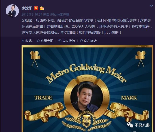 而小沈阳除了在第一届获奖外,也是第四届金扫帚奖获得者,再次获奖的他倒是在微博主动承认自己演技烂,接受群众批评,态度不错只是依旧不愿到现场领奖。