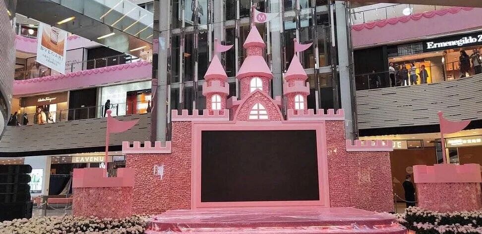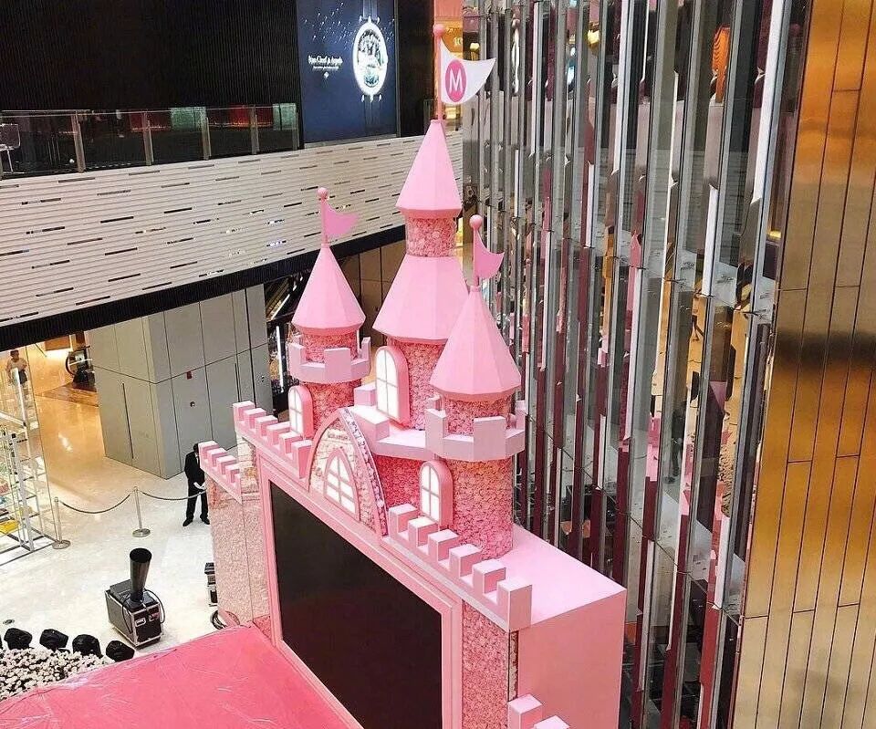除了爱心形状的鲜花拱门和和粉色地摊花池之外,最醒目的当属粉色城堡了。