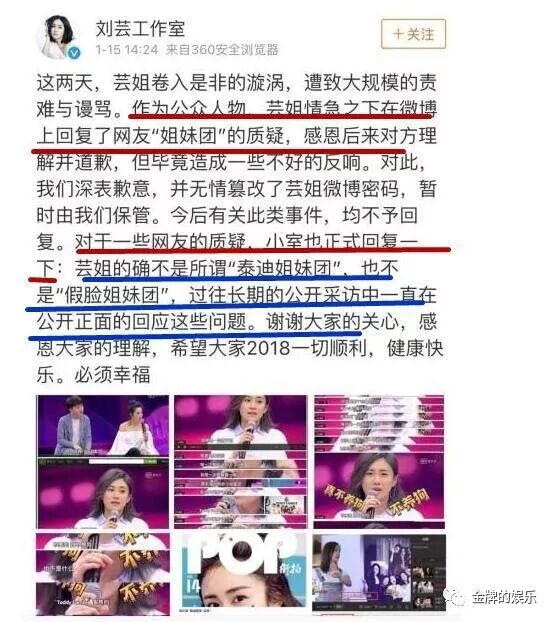 只不过就在李小璐落难之际,刘芸却采取了一种落井下石的做法,让人也是相当的不解。昨天下午,刘芸工作室正式发表声明,刘芸不是泰迪姐妹团的成员,而且也不是假脸姐妹团的成员,之前在多个访谈节目中都谈过类似的问题。