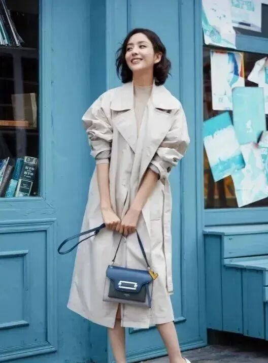 《佟丽娅穿搭小知识:米白色针织连衣裙 + 米白色风衣的穿搭优点解析》