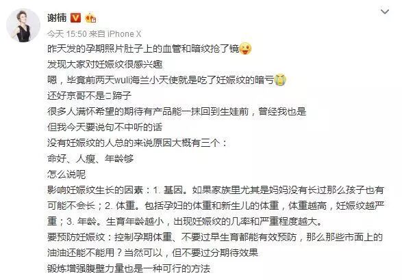 其实,这种现象属于静脉曲张,随着谢楠这种照片的发布,不少人也对妊娠纹感了兴趣。对此,谢楠也不忘在微博上普及一些这方面的知识。