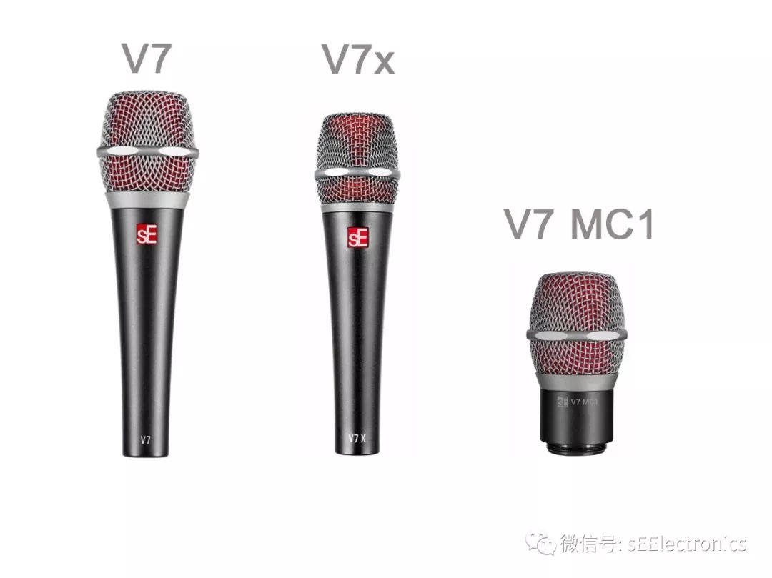 V7家族目前有三款产品,V7与 V7 MC 1 都是人声话筒,sE V7为有线版本,V7 MC1 音头为无线版本,需要搭配舒尔无线信号发射系统使用。还有V7x则为乐器专用。