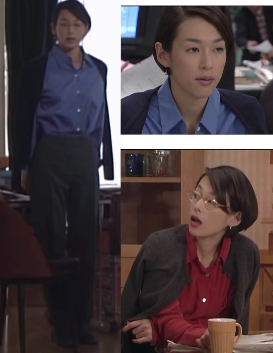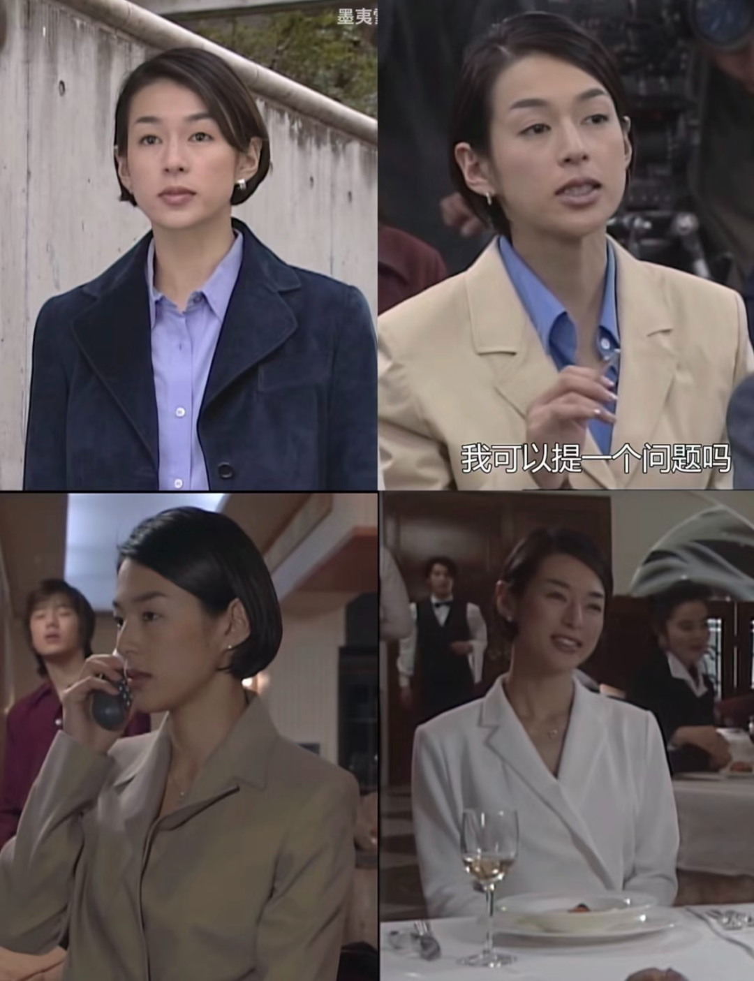 职场女精英的干练、果敢、优雅、时髦……在铃木保奈美一袭短发,无数制服衬衫、西装、风衣、皮衣、铅笔裙间展露无疑。