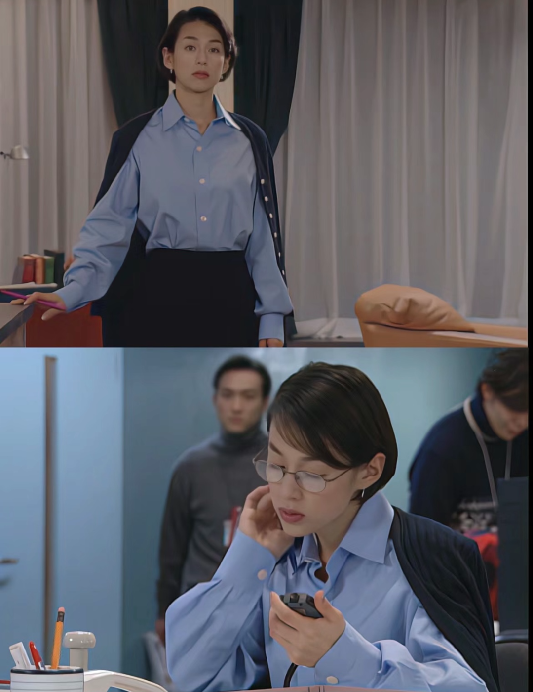 身材玲珑的她,穿的制服衬衫要比铃木保奈美的要更加修身,而克制的基本款样子则是不变的,搭配铅笔裙的组合也是没变……