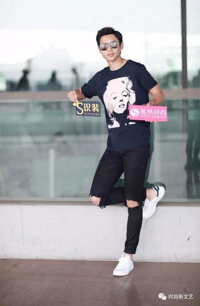 黑色圆领T恤,衣服上印着玛丽莲梦露的人像。下身搭配黑色破洞牛仔长裤,再搭配上一双白色运动鞋。头发撩上去露出额头,戴着黑色墨镜,简直太有魅力了。
