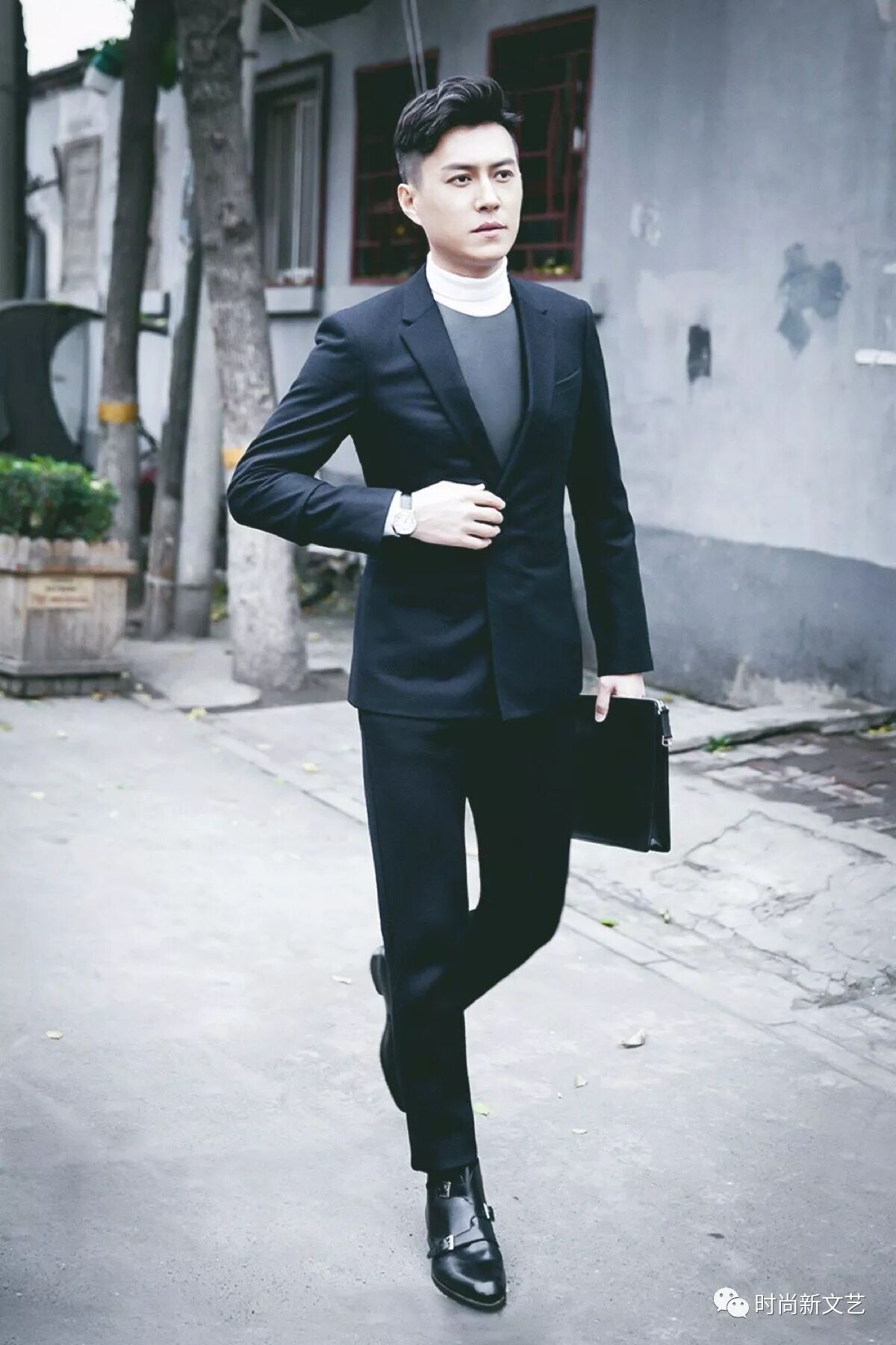 灰色高领针织衫,白色衣领,外搭一套帅气笔挺的西装外套,岑亮的黑色漆皮皮鞋更添霸气。利落的短发更显沉稳。
