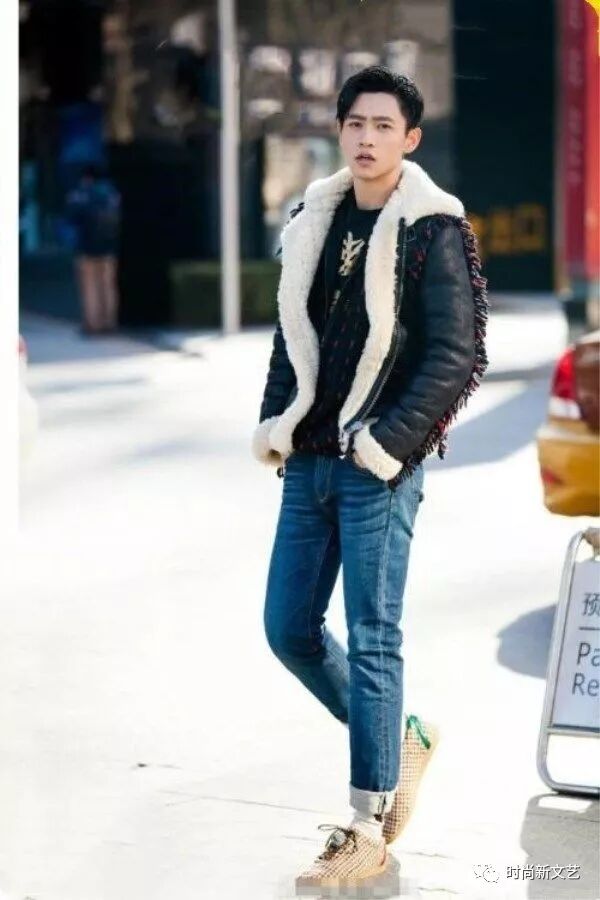 黑色T恤搭配黑色皮夹克外套,下搭深蓝色牛仔长裤,双手酷酷的插在裤子口袋里。搭配上卡其色运动鞋,裤脚卷起,更显高挑。