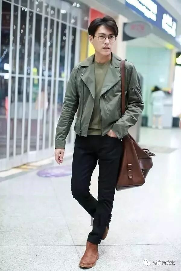靳东身着豆绿色T恤,外搭军绿色短款皮夹克,非常精神。黑色的牛仔长裤,配上深棕色短靴,一只手插在裤子口袋里,走起路来十分酷雅。