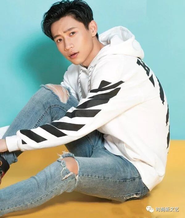 魏晨身着白色连帽卫衣,背后的黑色字母显得非常阳光。下身搭配上蓝色破洞牛仔裤,一股大男孩的清爽感。