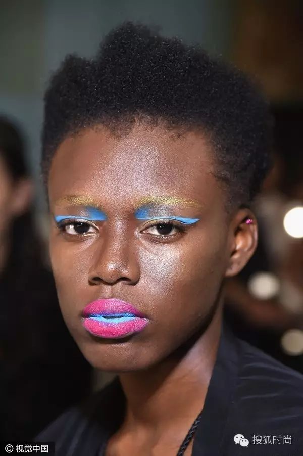 Jeans for Refugees by Johnny Dar这一季为模特儿们打造了色彩艳丽的荧光撞色妆容。无论是黄色与蓝色相叠加的眼妆,还是用冷暖色相互碰撞绘出的渐变唇妆,都已经十分抢镜。然而设计师并不满足于此,更加大胆的尝试浅色的金绿色眉毛,选择灰紫色作为修容阴影。