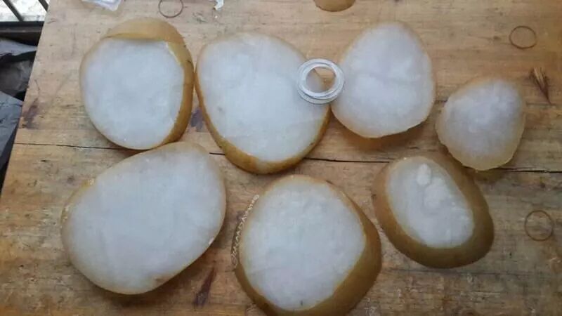 看这一桌子的“土豆片”就是刚才那块石头切出来的,小编都惊讶了,没错,这是翡翠,属于白冰种翡翠,这时老汉还没缓过神来.......