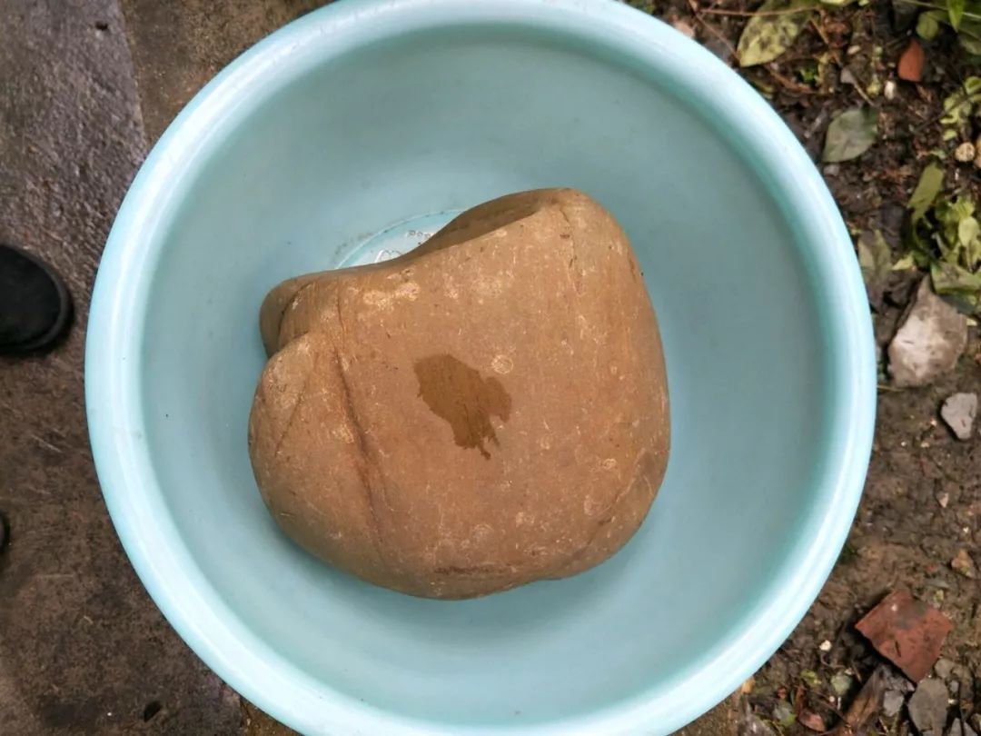 一位老汉在自家后院种花草是挖到这样一块石头,体型不大不小,挖了好半天才挖出来,大侄子一看就说这石头该不会是块宝贝吧!