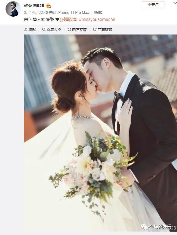 2020年3月14日,赖弘国晒婚纱照庆祝白色情人节;