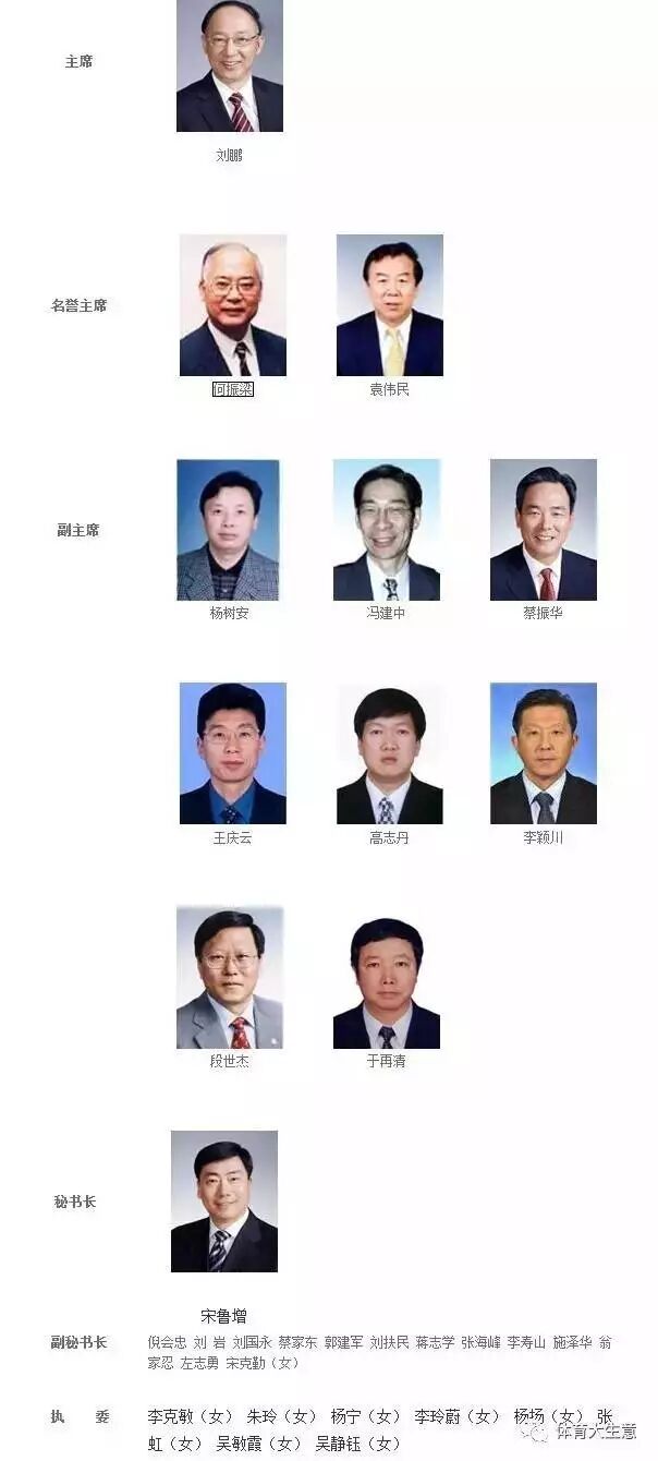 此外,在昨天召开的中华全国体育总会第九届四次常委会上,审议通过了中华全国体育总会人员调整方案。国家体育总局局长、党组书记苟仲文担任中华全国体育总会主席,体育总局副局长、党组成员赵勇,中央军委政治工作部宣传局副局长姜秀生担任中华全国体育总会副主席,十二届全国政协外事委员会副主任、体育总局原局长、党组书记刘鹏担任中华全国体育总会名誉主席。全国体育总会自成立至今,历任主席分别为:马叙伦、马约翰、钟师统、李梦华、伍绍祖、李志坚、刘鹏、苟仲文。