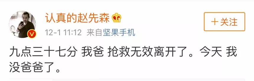 12月1日,赵勇的微博,一句“今天,我没爸爸了”让所有人眼睛很酸
