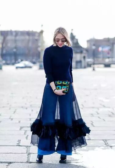 除了蕾丝的透视裙之外,分层式的薄纱裙也是个不错的选择。街拍达人就曾示范透视裙与阔腿喇叭裤的搭配。