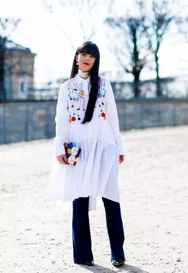 相比于容祖儿的搭配,街拍达人的这身示范更有“优化身材”的作用。印花的白衬衫不仅俏皮,还是十足的遮肉担当,穿阔腿裤还想遮肉显瘦,不妨试试长摆衬衫裙的叠穿。