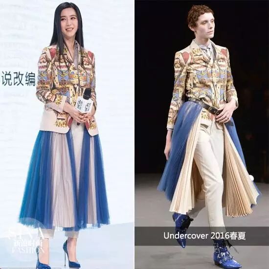近期,为新电影宣传的范爷,在活动现场身穿一身Undercover 2016春夏的时装亮相。对范爷的穿衣习惯有些了解的人都能发现,Undercover并不是范爷常穿的品牌。在女神礼服与霸气“男友装”之间游走的范冰冰平时也很少尝试这种带有些叛逆的复古风格。那是什么吸引范爷去尝试新风格呢?!想必就是这百褶蓬蓬裙与裤装的叠穿!恋爱后的范爷多少有些少女心爆棚,蓬蓬裙则是少女们的挚爱,更何况是Undercover这款增加了今年最火爆的百褶元素的蓬蓬裙,范爷自然不能错过。而裤装与百褶蓬蓬裙的搭配,则在一定程度上弱化了裙装“小女生”的意味,为整身搭配增加了一份帅气之感。只是不知道范爷是不是对自己的腰部曲线不自信,印花西装套在裙装外的搭配,实在是整身造型最大的败笔。