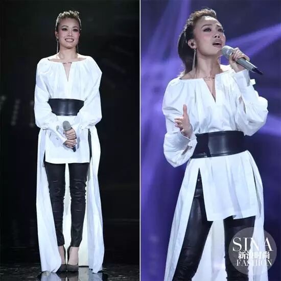 讲真,在《我是歌手》第四季的“赛场”上,也就只有天后李玟和容祖儿的穿搭还算过关。而热辣的李玟每次的造型总有种用力过度的嫌疑。相比之下,容祖儿的穿搭则是带有低调意味的时髦。容祖儿的这身白色衬衫裙与黑色皮裤的搭配,看似简约却融合了多种时髦小心机,一字领的设计让她小秀性感锁骨,而黑色腰封则更加突出了容祖儿引以为傲的小蛮腰。黑色皮裤的混搭则满足了她狂秀美腿的愿望。