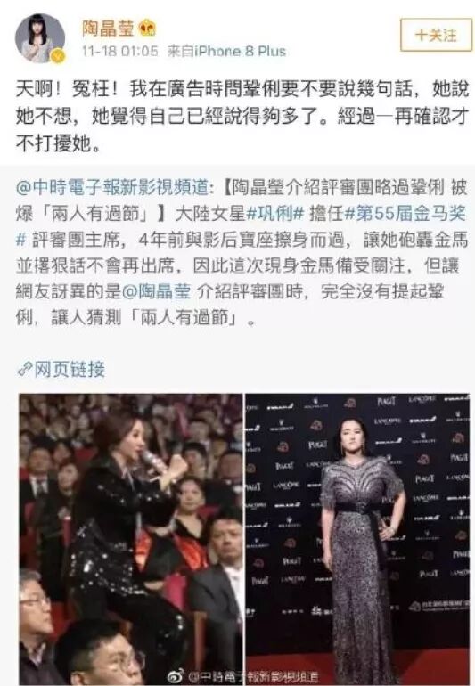 因为一直被网友骂,在金马奖后两天,陶晶莹也正面喊冤了:“天啊!冤枉!我在广告时问巩俐要不要说几句话,她说她不想,她觉得自己已经说得够多了。经过一再确认才不打扰她。”