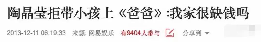 陶晶莹最大的打脸事迹是抨击《爸爸去哪儿》,当时这档节目很火,她被问是否要去参加,回答是:是我家里很缺钱吗?我干嘛让小孩受这个苦呢?