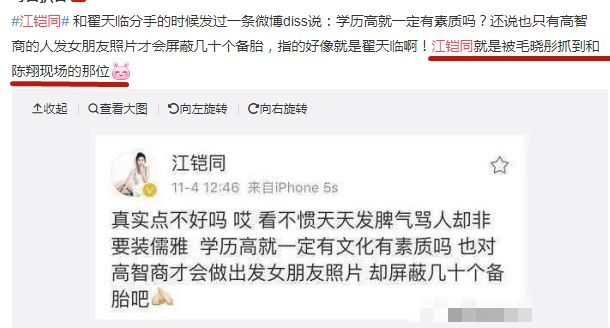 至于今天上了热搜的“前女友”江铠同,也是有点心急的~翟先生的公司再怎么置之不理,也不至于让她这样的“三线”出来“踩上位”,所以还没等江小姐这波热搜洗白自己、就已经出现了不少“两个都不是什么好货色”的通稿了。毕竟江小姐得罪的不光是翟先生一家,“渣男”和“被插足的毛小姐”可都对她不满着呢~