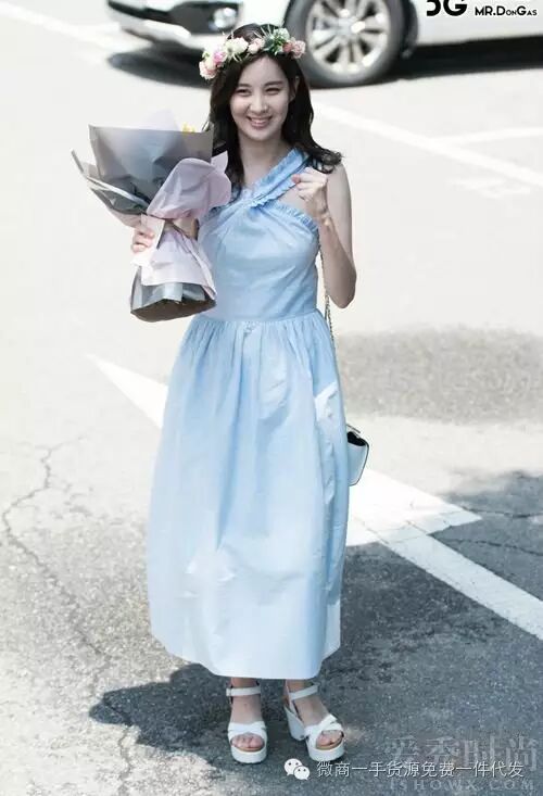 徐贤身材高挑,气质清新,穿浅蓝色连衣裙配白色凉鞋文艺十足,如清风扑面,显得肌肤好白皙,裙子的肩部设计别致动人。