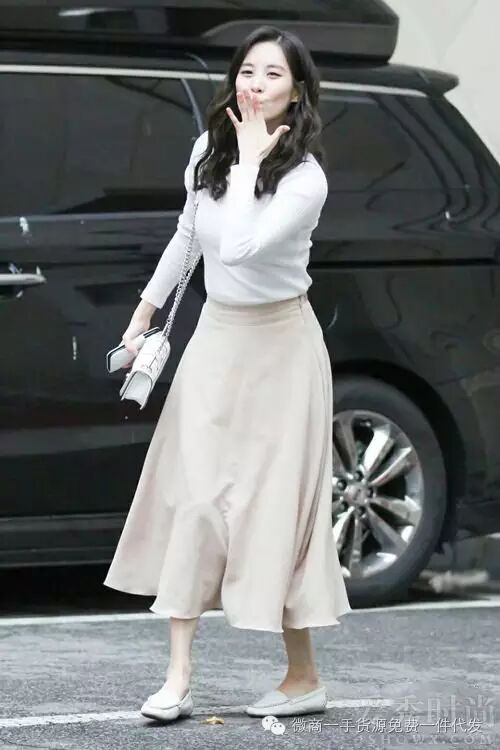 徐贤穿白色长袖上衣配浅卡其色长裙,简单不失质感,尽显她温柔大方的一面。