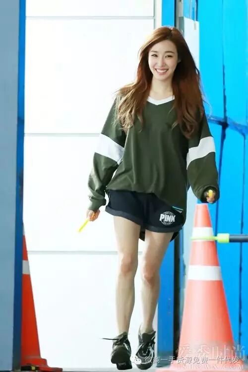 黄美英穿宽大的军绿色卫衣配深色短裤,韩系休闲风,俏皮活泼,笑容甜美无敌,虽然腿不是很长,不过又白又直,也算是美腿一双了。