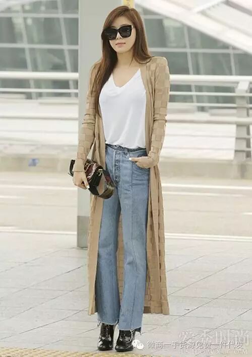 河智苑现身机场,穿卡其色长款针织开衫,内搭白T恤和牛仔裤、靴子,显得高挑迷人,颇有气场。