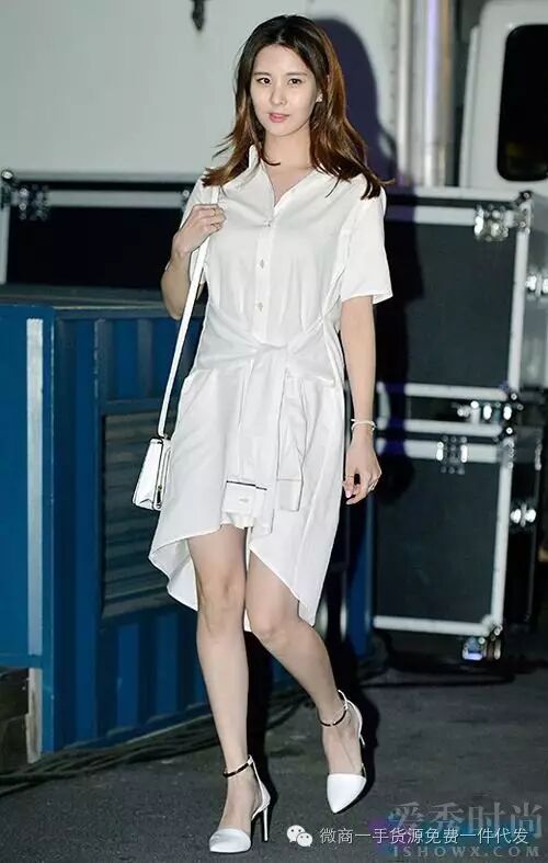 徐贤穿白色连衣裙配白色尖头高跟鞋,清新淑女风,连衣裙腰间采用长袖系带设计,个性十足,也是近两年比较流行的细节了。